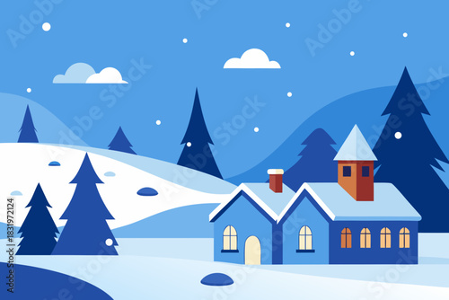 Fototapeta premium Winter snowy village cartoon background simple vector illustration