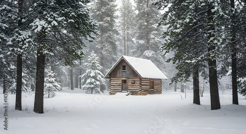 Naklejka premium Winter Solitude Log Cabin Retreat Deep in a Snow Covered Forest