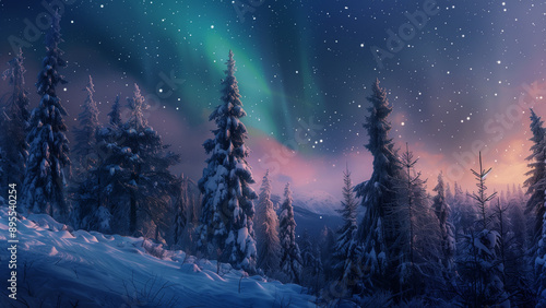 Naklejka premium Winter Solstice Magic: Snow-Covered Pines Under the Aurora Borealis