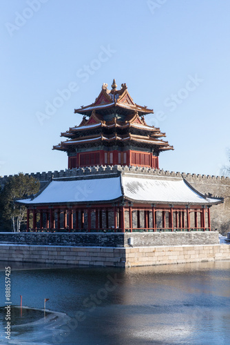 © cherryhai, Fototapeta premium winter sonw view of the corner tower and moat of the Forbidden city