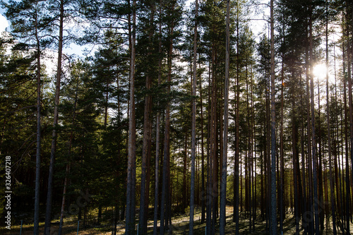 Fototapeta premium Winter sunny day in a pine forest, Russia.