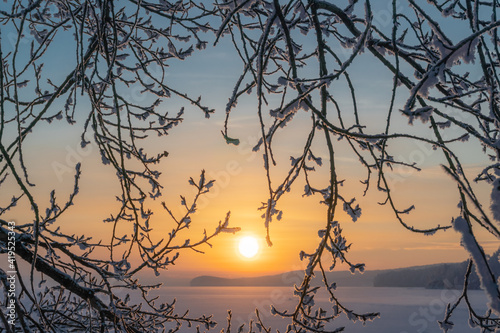 Fototapeta premium Winter sunrise and tree branches covered with frost