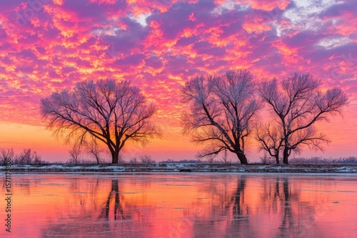 © Creatives, Obraz premium Winter sunrise over a frozen river. Silhouette of trees with frost, vibrant pink and orange sunrise reflected on ice-covered water