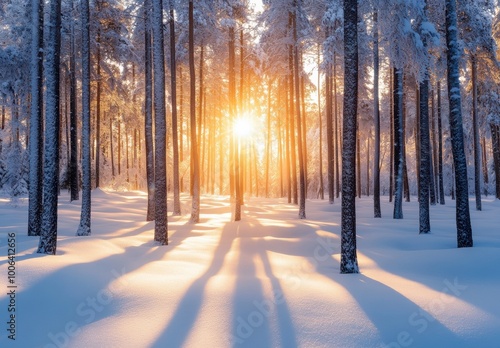 © warunthorn, Fototapeta premium Winter Sunset Forest.