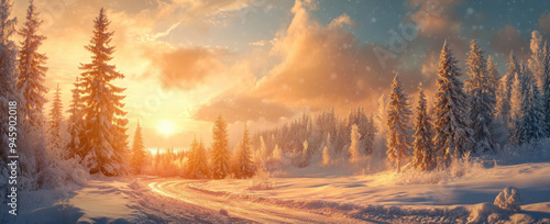 © SunPunjiStudio, Naklejka premium Winter Sunset Forest.