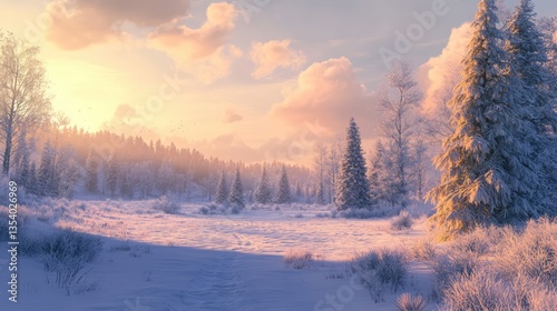 © SK, Fototapeta premium Winter Sunset Over Snowy Landscape with Frozen Trees in Saariselka