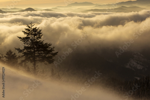 © danmir12, Obraz premium Winter sunset over the clouds - Panoramic view