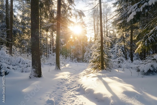 Naklejka premium Winter sunset through snowy forest trees with sunlight beams