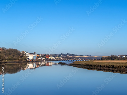 Fototapeta premium Winter sunshine view of Bideford and River Torridge estuary, high tide, north Devon, England.