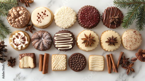 Fototapeta premium Winter-Themed Flat Lay Arrangement of Various Christmas Cookies on a Marble Surface with Pine Elements and Spices for a Festive Holiday Atmosphere