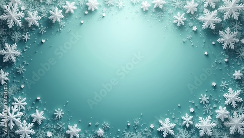Fototapeta premium Winter themed teal background with icy crystals and snowflakes framing a...