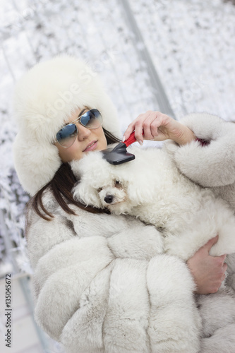 © Addoro, Fototapeta premium Winter time fun. Woman wearing fur hat and winter coat holding her dog while she is grooming him. Brushing the dog in the winter time.