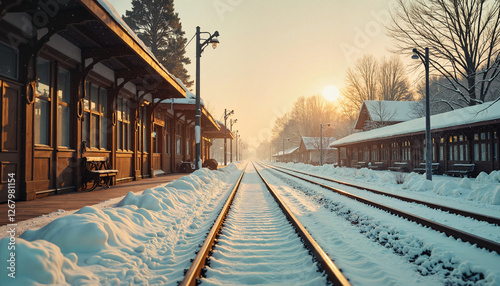 © Khelga Volkova, Fototapeta premium Winter train station with snowy tracks at sunrise