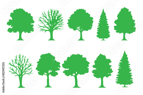 Obraz premium Winter tree silhouette set, bare deciduous and pine trees vector collection, leafless forest clipart, seasonal nature illustration pack