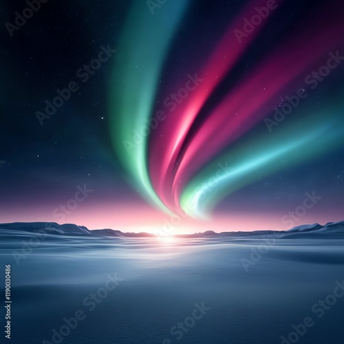Fototapeta premium Winter twilight, vibrant auroras dancing over a snowy field, artistic framing, 3D illustration