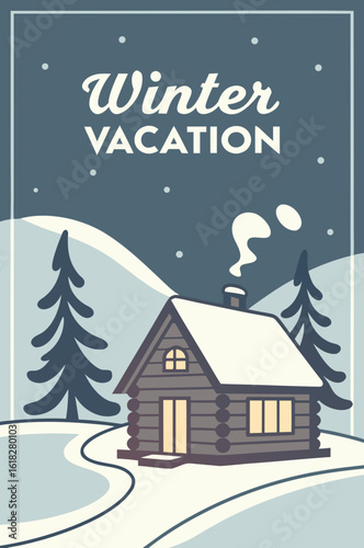 Fototapeta premium Winter vacation poster with cabin in snowy landscape
