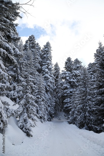 © murat, Fototapeta premium Winter view in a mountain forest covered with fresh snow. Christmas landscape