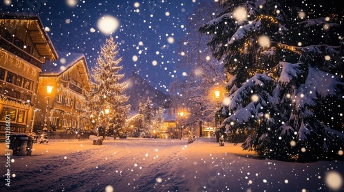 © Official, Fototapeta premium Winter Village Covered in Sparkling Snow at Night