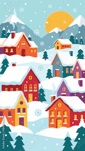Naklejka premium Winter village illustration with colorful houses, snowy mountains, and...