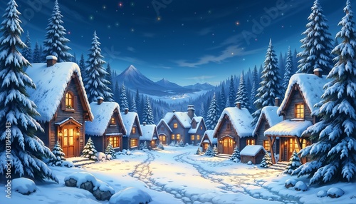 Fototapeta premium Winter village landscape at night with cozy cabins in a snowy forest