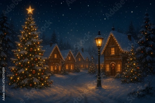 Naklejka premium Winter Village Landscape – Christmas Lights and Snow Covered Houses in Night Scene