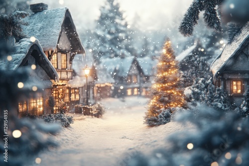 © Mandeep, Naklejka premium winter village scene with snow and festive lights
