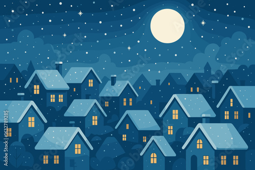 Fototapeta premium Winter village under a full moon with snow-covered rooftops and glowing windows