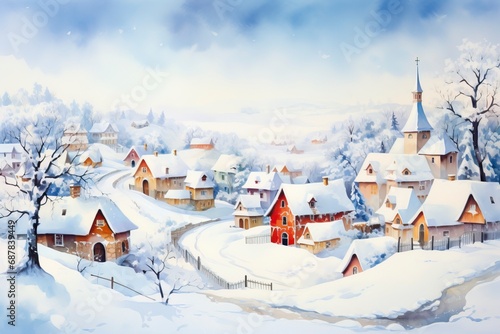 Obraz premium Winter village watercolor painting illustration made by generative ai