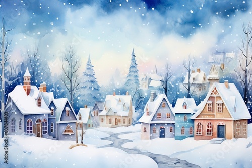 © Dzikrul Husnani, Fototapeta premium Winter village watercolor painting illustration made by generative ai