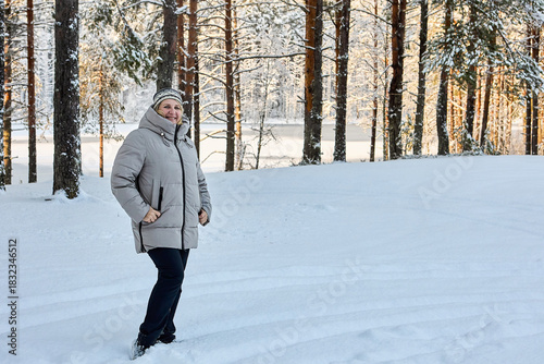 Fototapeta premium Winter walk through snowy forest, warmly dressed middle aged woman poses to...