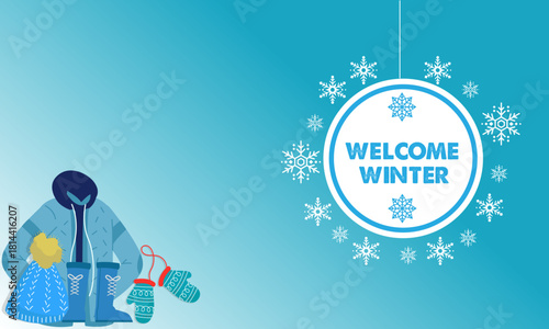 Naklejka premium Winter Welcome with Warm Clothes Embracing the Cold Season's Appeal with Snowflakes and Stylish Garments, a Perfect Visual