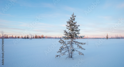 Naklejka premium Winter wide panorama beautiful northern snowy sunset landscape with spruce...