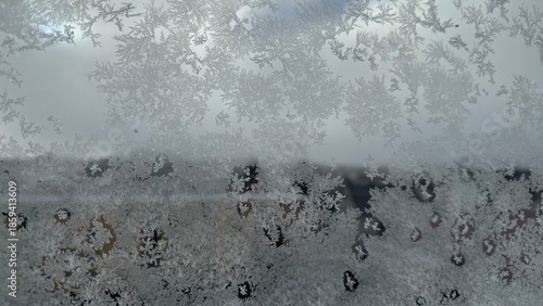 Obraz premium Winter window view, snowflakes and ice on glass
