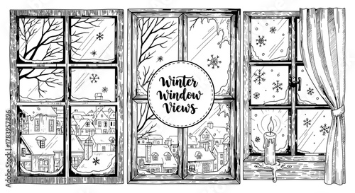 © LOBSTER LARRY, Fototapeta premium Winter window views with snowflakes and candle in hand-drawn style