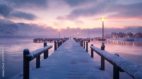 © sup, Obraz premium Winter Wonderland: A Serene Snow-Covered Pier at Sunset