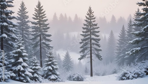 Fototapeta premium Winter Wonderland: A serene winter scene unfolds with snow-laden pine trees standing tall against a misty backdrop, evoking a sense of peace and tranquility. The soft.