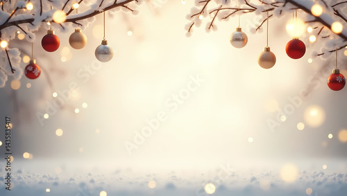 Fototapeta premium Winter Wonderland Christmas: Festive Christmas baubles adorn snow-covered...