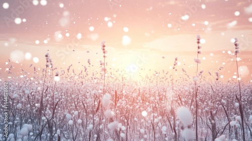 © musthofa, Obraz premium Winter wonderland field blanketed in snow at sunset.