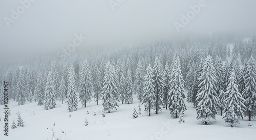 © VectorStar, Naklejka premium Winter wonderland forest landscape with snow covered pine trees panorama