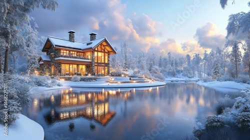 © Arwin, Fototapeta premium Winter wonderland home by a frozen lake.