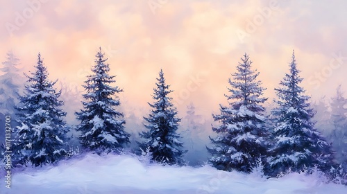 Naklejka premium Winter wonderland landscape with snow-covered trees at dawn. Soft, pastel colors create a serene, dreamy atmosphere.