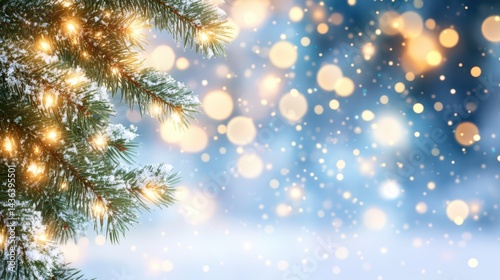 © mashimara, Naklejka premium Winter Wonderland Lights: Sparkling Christmas lights adorn a snow-dusted pine branch, creating a magical winter scene.