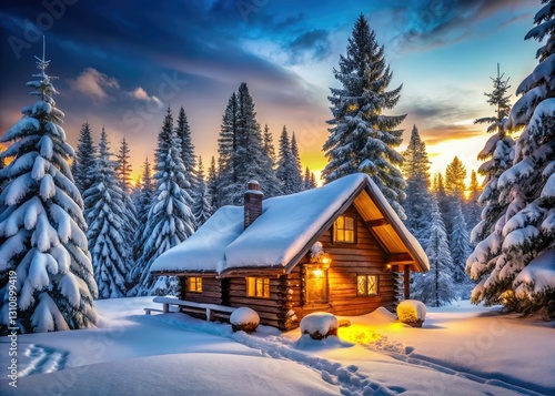 © dokrak, Fototapeta premium Winter Wonderland Log Cabin Panoramic - Snowy Trees, Peaceful Cabin, Serene Landscape