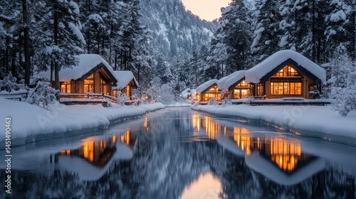 © lipur, Fototapeta premium Winter wonderland: Reflections of cozy cabins along a snow-covered waterscape