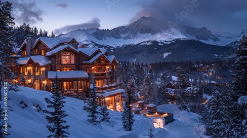 Fototapeta premium Winter Wonderland Resort: Cozy Cabins and Hot Tub Experience in Snowy Mountains at Twilight
