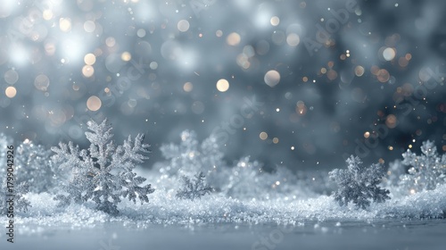 © Johannes, Naklejka premium winter wonderland scene with snowflakes glitter and bokeh lights against a soft gray backdrop