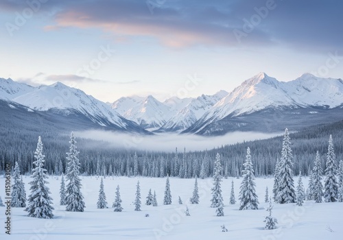 Fototapeta premium Winter wonderland, snow-covered mountains, misty peaks, frosted pine forest,...