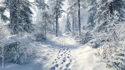 © Johannes, Fototapeta premium winter wonderland snow forest landscape with footprints on path through snowy trees scenery outdoor view