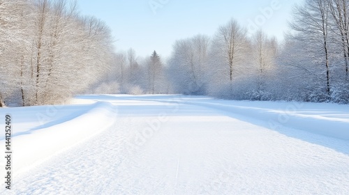 © Kaminashi Nozomi, Fototapeta premium Winter wonderland snow trail through a frosted forest