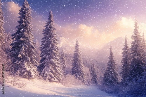 Naklejka premium Winter wonderland, snowy forest, majestic pine trees, heavy snowfall,...
